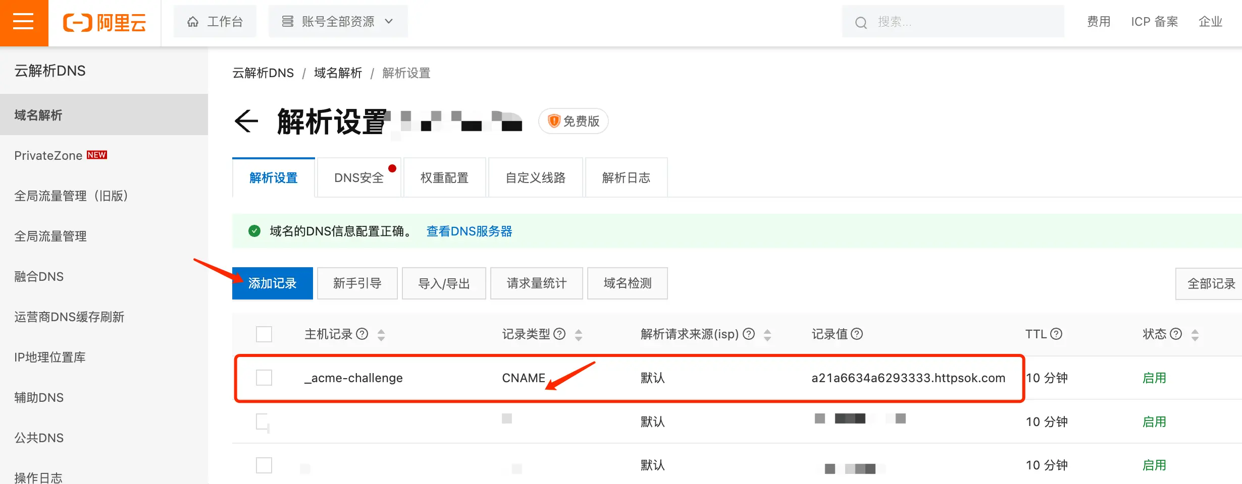 因为证书签发时,CA厂商要验证这个域名是否属于您,需要您在域名服务商处添加一条 DNS 解析记录。
